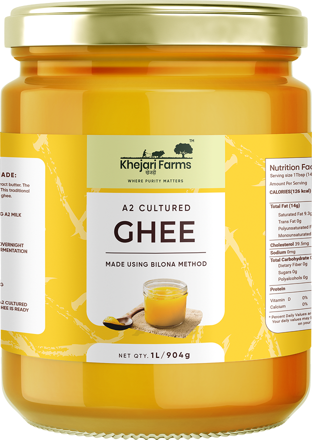 A2 Bilona Cow Ghee is made using fresh desi cow milk. The Cows are free-grazed. The milk from them is brought to a boil and naturally cooled down to room temperature and inoculated with a natural starter culture and left overnight to make curd. The curd is churned using the traditional 'Bilona method'